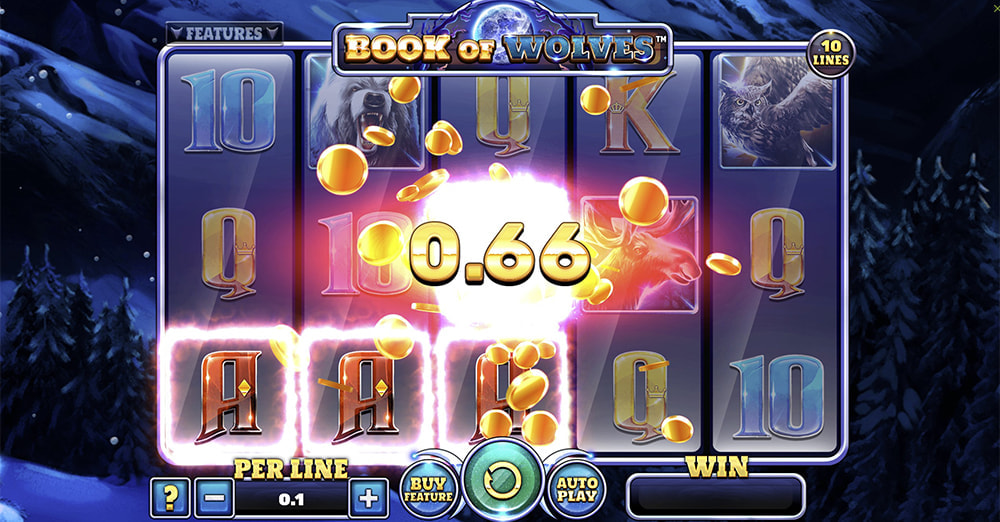 Book of Wolves entführt euch in eine eisige Wildnis, in der der Mondschein die schneebedeckte Landschaft erleuchtet. Der Slot läuft auf einem 5×3-Raster mit 10 festen Gewinnlinien. Das Gameplay folgt dem beliebten „Book of“-Prinzip: Ein besonderes Buch-Symbol fungiert gleichzeitig als Wild und Scatter.
