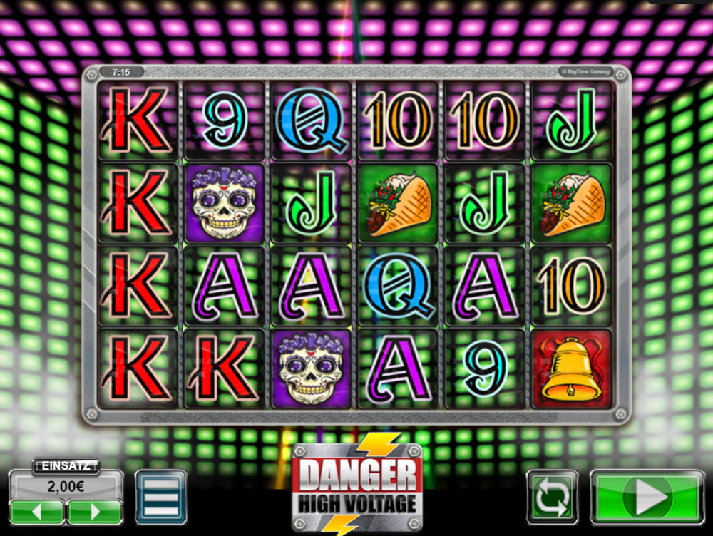 Beim Danger High Voltage online spielen finden sich eine Vielzahl von Symbolen, von denen Buchstabensymbole und Tacos zu den niedriger zahlenden gehören. Höherwertige Symbole umfassen Glocken und Totenköpfe, die größere Gewinne versprechen. Die bunten Discokugeln tragen ebenfalls zu ansehnlichen Auszahlungen bei.