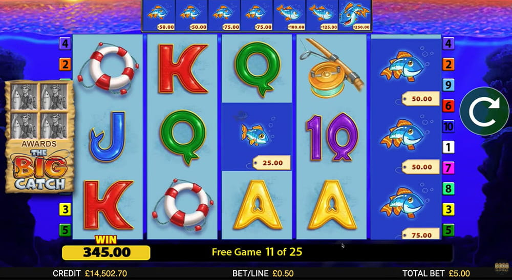 Während der Freispiele können zusätzliche Gewinne erzielt werden, wenn das spezielle Anglersymbol erscheint, das zusätzliche Fische mit verschiedenen Geldwerten fängt. Diese speziellen Fänge addieren sich zu den regulären Linien-Gewinnen, was die Gesamtgewinne der Freispiele erheblich steigern kann.