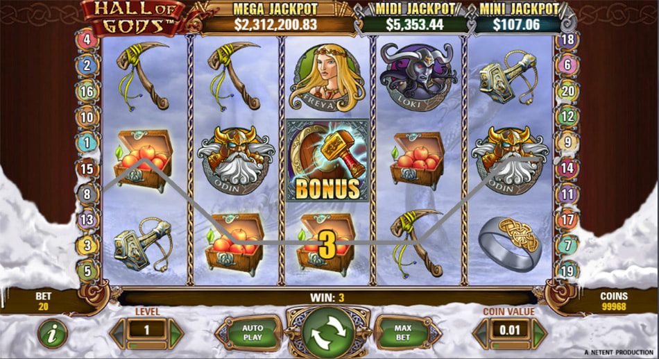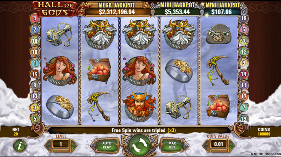 Hall of Gods ist ein Online Spielautomat von NetEnt mit einer RTP Quote von 95,30%. Der NetEnt Slot hat 20 Gewinnlinien auf 5 Walzen und bietet Freispiele. Hier findet ihr die besten Hall of Gods Online Casinos, um diesen Slot entweder mit Echtgeld mit 1€ Einsatz zu spielen oder bei einigen Anbietern auch kostenlos als Demo zu testen.
