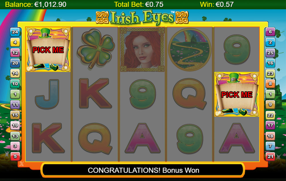 Bei Irish Eyes wird die Bonusrunde aktiviert, wenn der Glückskobold Symbol auf den Walzen 1 und 5 gleichzeitig erscheint. Spieler können dann aus verschiedenen Symbolen wählen, um Sofortgewinne zu enthüllen. Diese interaktive Auswahl bietet eine spannende Abwechslung zum Standard Spielablauf.