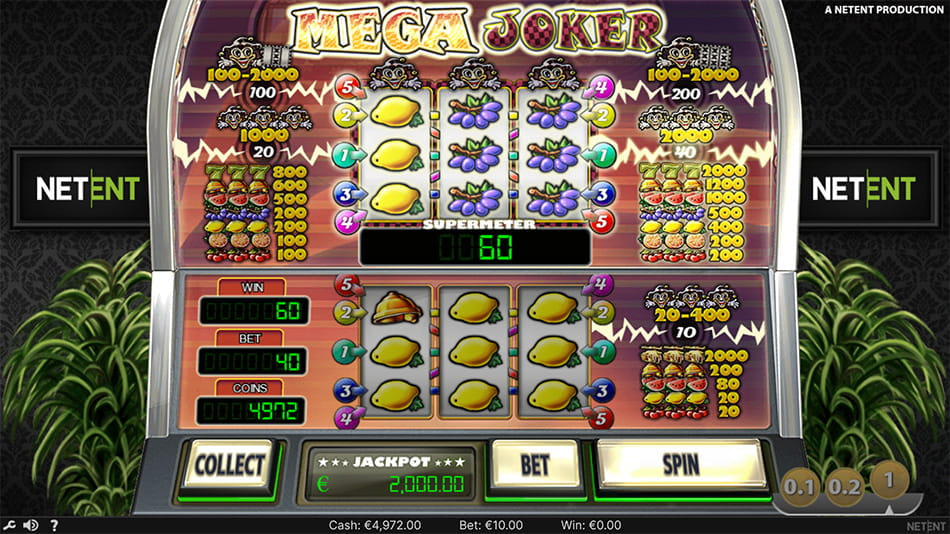 Mega Joker ist ein Online Spielautomat von NetEnt mit einer RTP Quote von 99,00%. Der NetEnt Slot hat 5 Gewinnlinien auf 3 Walzen und bietet einen progressiven Jackpot sowie den Super-Meter-Modus. Hier findet ihr die besten Mega Joker Online Casinos, um diesen Slot entweder mit Echtgeld mit 1€ Einsatz zu spielen oder bei einigen Anbietern auch kostenlos als Demo zu testen.