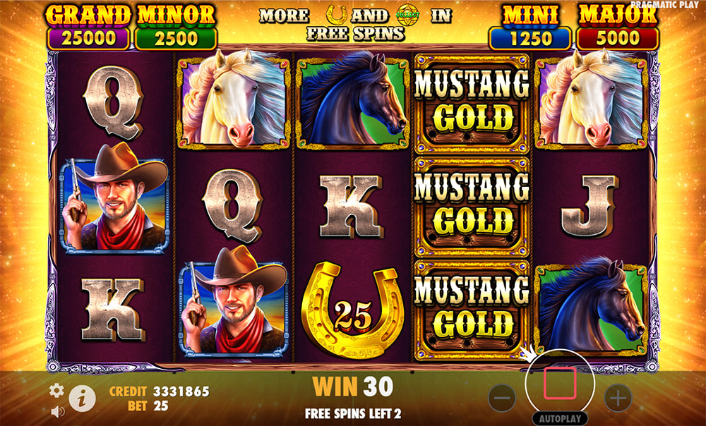 Mustang Gold ist ein Online Slot von Pragmatic Play mit 96,53% RTP. Er hat 25 Gewinnlinien auf 5 Walzen und bietet Bonus Runden, Jackpots und Freispiele. Hier findet ihr die besten Mustang Gold Online Casinos, um diesen Slot entweder mit Echtgeld mit einem Einsatz von bis zu 1 Euro zu spielen oder bei einigen Anbietern auch kostenlos als Demo zu testen. Dieser Slot bringt euch in den Wilden Westen mit Cowboys und Wildpferden. Ihr könnt euch auf spannende Bonusspiele, Freispiele und hohe Gewinnmöglichkeiten freuen.