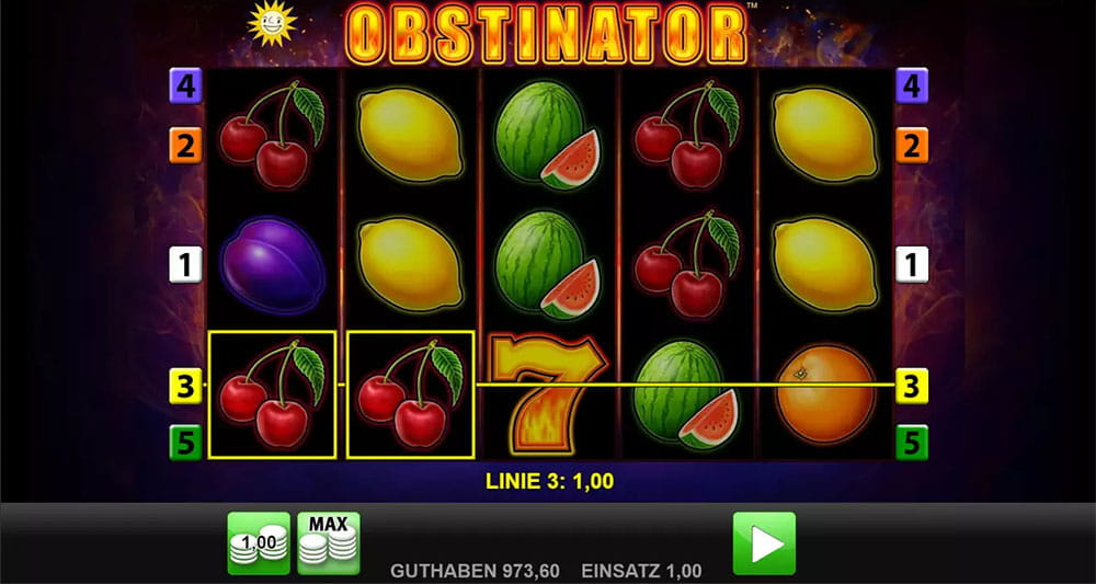 Obstinator ist ein Online Spielautomat von Merkur mit einer RTP Quote von 94,33%. Der Merkur Slot hat 5 Gewinnlinien auf 5 Walzen und bietet keine Freispiele oder Jackpot. Hier findet ihr die besten Obstinator Online Casinos, um diesen Slot entweder mit Echtgeld mit 1€ Einsatz zu spielen oder bei einigen Anbietern auch kostenlos als Demo zu testen.