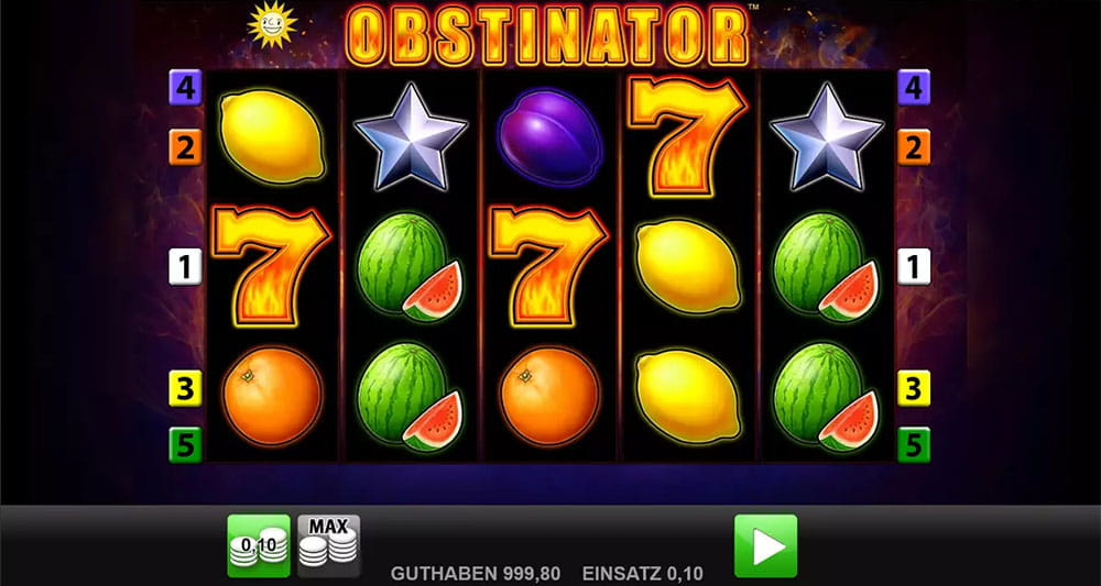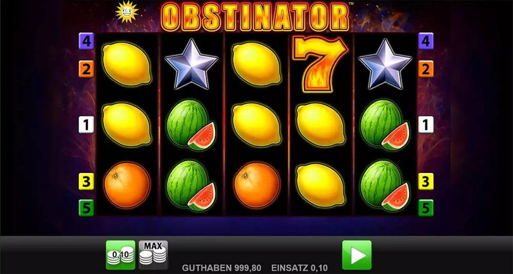 Der Obstinator Slot von Merkur entführt Spieler in die Welt der klassischen Früchteautomaten. Dieser Slot besticht durch sein einfaches und geradliniges Design, das vor allem Fans traditioneller Spielautomaten anspricht. Mit 5 Walzen und 5 Gewinnlinien bietet der Automat ein unkompliziertes Spielerlebnis, das sowohl Neulinge als auch erfahrene Spieler schätzen werden.