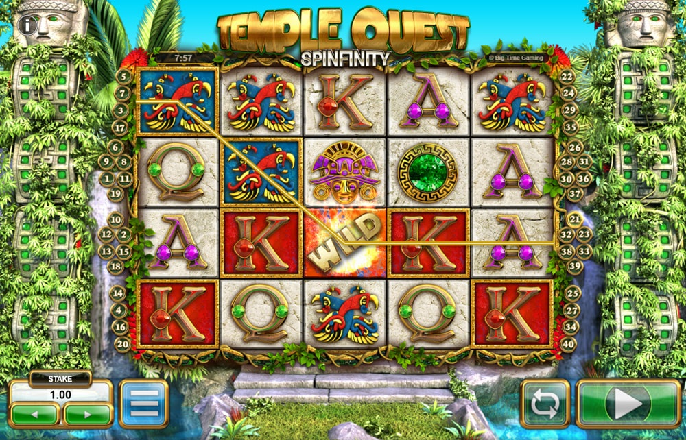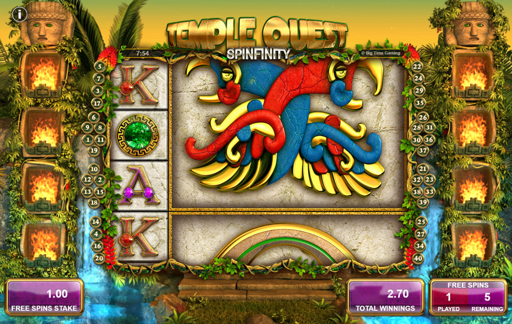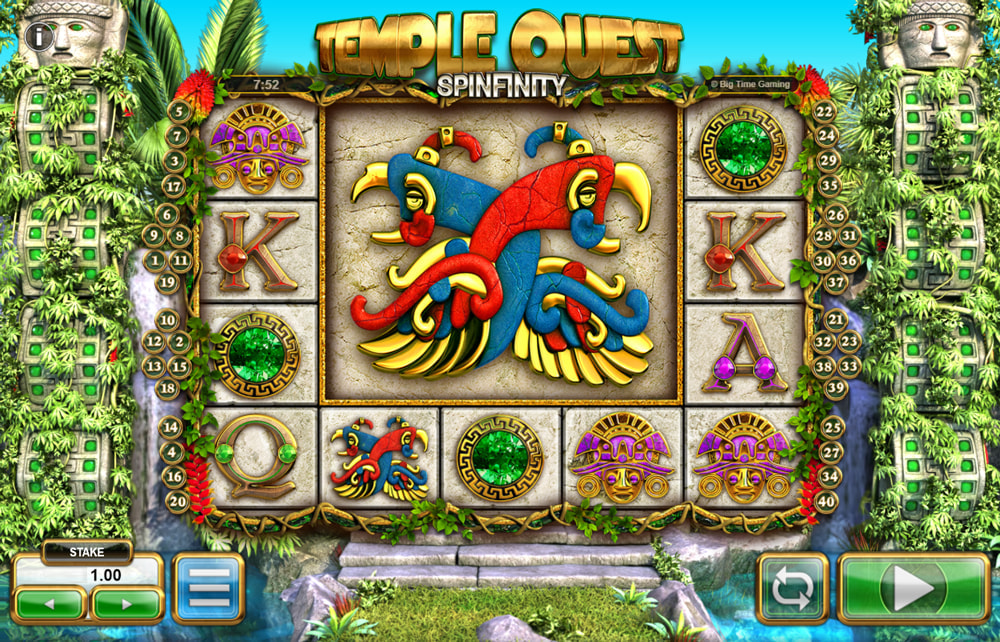 Temple Quest Spinfinity ist ein Online Spielautomat von Big Time Gaming mit einer RTP Quote von 96,00%. Der Big Time Gaming Slot hat 40 Gewinnlinien auf 5 Walzen und bietet Freispiele und Mega Icons. Hier findet ihr die besten Temple Quest Spinfinity Online Casinos, um diesen Slot entweder mit Echtgeld mit 1€ Einsatz zu spielen oder bei einigen Anbietern auch kostenlos als Demo zu testen.
