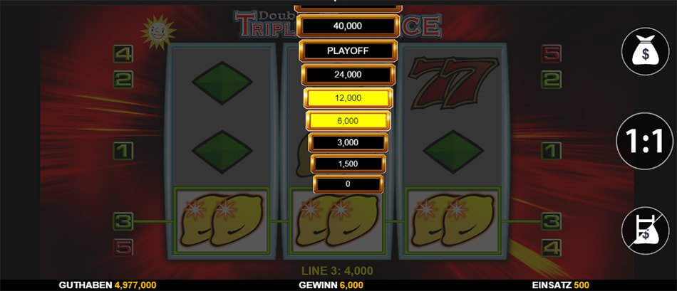Beim Spielen von Triple Chance online könnt ihr das Rewin Feature aktivieren, indem ihr alle Walzenfelder mit dem gleichen Symbol füllt. Diese Gelegenheit ergibt sich zwar nicht sehr häufig, aber wenn es passiert, kann es eure Gewinne deutlich steigern. Aus meiner persönlichen Erfahrung heraus zahlt sich das Feature aus, besonders wenn ihr Glück habt und mehrfach hintereinander auf dem grünen Feld des Glücksrads landet. Für diejenigen unter euch, die Wert auf schnelle Gewinnauszahlungen legen, empfehle ich, einen Blick auf unsere Empfehlungen für ein Online Casino mit schneller Auszahlung zu werfen, um das Beste aus euren Gewinnen herauszuholen.