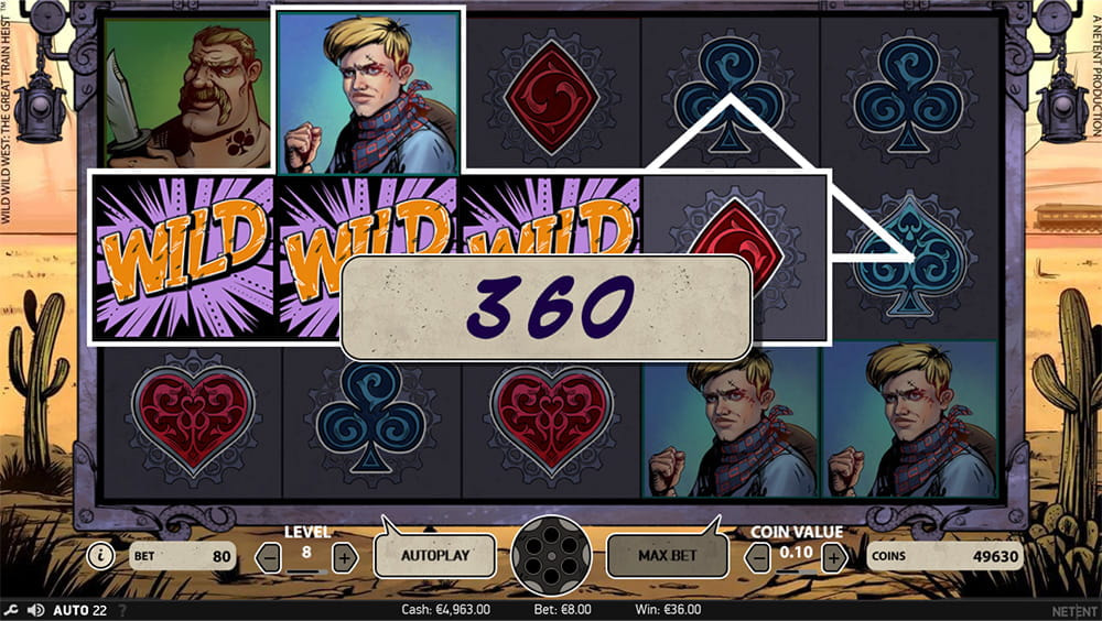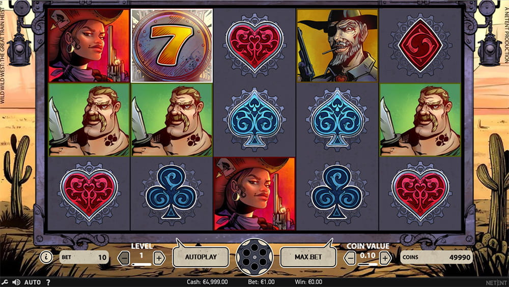 Wild Wild West ist ein Online Spielautomat von NetEnt mit einer RTP Quote von 96,74%. Der NetEnt Slot hat 10 Gewinnlinien auf 5 Walzen und bietet Freispiele, Bonusrunden und Autoplay Funktion. Hier findet ihr die besten Wild Wild West Online Casinos, um diesen Slot entweder mit Echtgeld mit bis zu 1€ Einsatz zu spielen oder bei einigen Anbietern auch kostenlos als Demo zu testen.